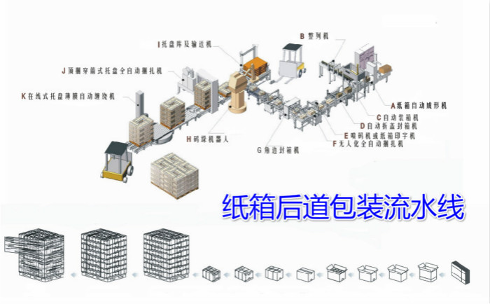 全自动后道包装生产线是一个广义的概念,按照产品形态分类,可以分为颗粒状产品后道包装生产线、粉剂状产品后道包生产线、液体后道包装生产线、片状产品后道包装生产线;按照产品包装方式可以分为:盒装产品后道包装生产线、袋装产品后道包装生产线、灌装产品后道包装生产线、桶装产品后道包装生产线、瓶装产品后道包装生产线;按照行业分为食品行业后道包装生产线、饮料行业后道包装生产线、药品行业后道包装生产线、日用品行业后道包装生产线、乳品行业后道包装生产线、生物化肥种子饲料添加剂等行业的后道包装生产线。 后道包装生产线概括的可以分为纸箱后道包装生产线和大袋重袋包装生产线。华联机械集团是国内唯一具有自主研发能力,全线产品自主设计制造的后道包装生产线集团性企业。   纸箱自动包装生产线是我厂累积20年生产制造包装机械经验逐步累积延伸的新一代自动包装生产线。整线由纸箱开箱机、装箱机、封箱机、捆扎机、码垛机器人、托盘库及输送机、顶捆箭式全自动捆扎机、及在线式自动式缠绕膜机组成。在整条纸箱包装生产线中可以根据生产要求进行加减,比如说增加防伪防窜货软件系统、物料除尘系统、重量选别或金属探测系统、不合格产品剔除系统(不合格的中包(重量)自动剔除到指定位置)、自动投放干燥剂设备、角边封箱机等系统。   大袋包装生产线是新一代的自动包装线,可将粉、粒状原料生产过程中的称重、供袋、取袋、装袋、夹口、折边、封袋、批号打印、倒袋整形、金属检测、重量复检、剔除、输送、机器人码垛、空托盘配送、实托盘输送、实托盘顶捆、托盘缠绕、实托盘输出等作业全部实现包装自动化。大袋自动包装生产线工程也可以形象的形容为从供袋到卡车工程。 纸箱后道包装生产线和大袋重袋后道包装生产线的整线示意图: